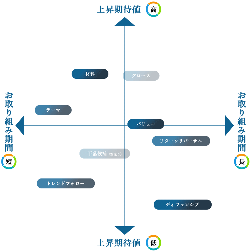 バリュー株やグロース株また、下落候補から売りやディフェンシブ銘柄など、それぞれのタイプがトレンドを繰り返します。これらの銘柄に集中する時期は常に変動することから、どんな時期でも“狙うべき銘柄”というものが相場には存在します。